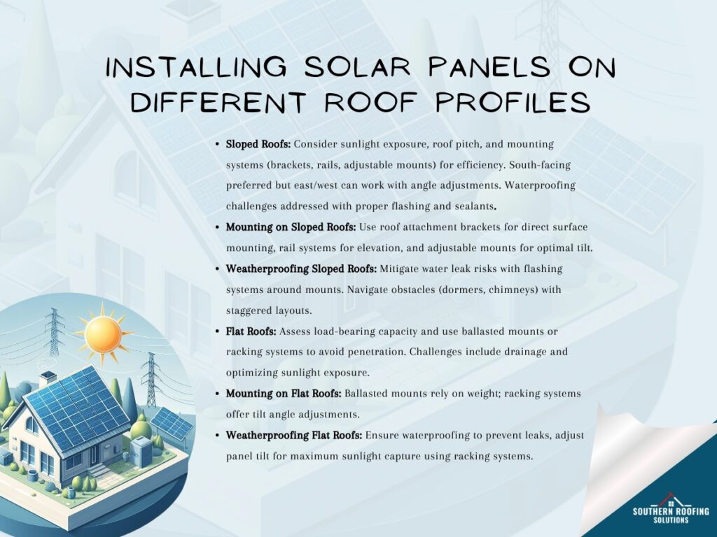 Sloped roofs present specific waterproofing and weatherproofing challenges, and proper flashing systems and sealants around mounting points help mitigate the effects. Sloped roofs often feature elements such as dormers, chimneys, or skylights that may cast shadows or impact the available space for solar panels.